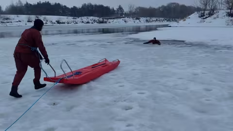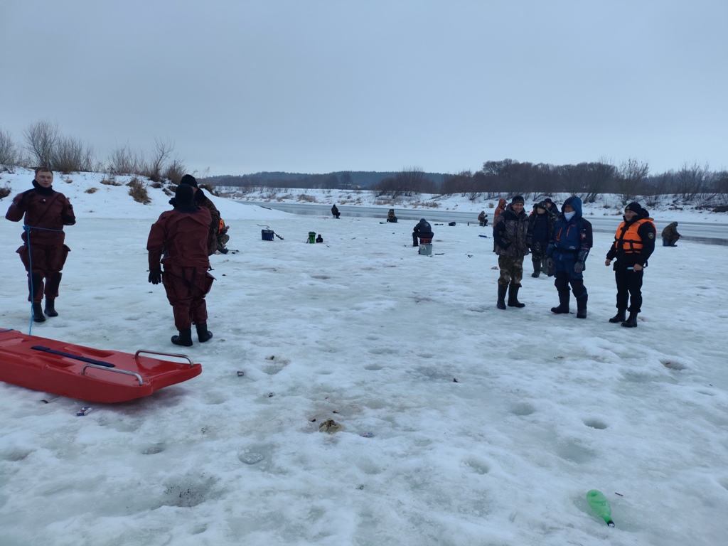 В ходе одного из рейдов провели тренировку с помощью спасательной доски, когда спасатель, лежа на доске, подползает к полынье и помогает рыбаку забраться на нее.
