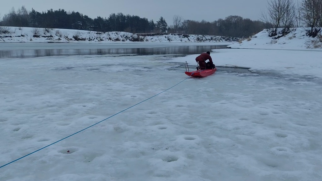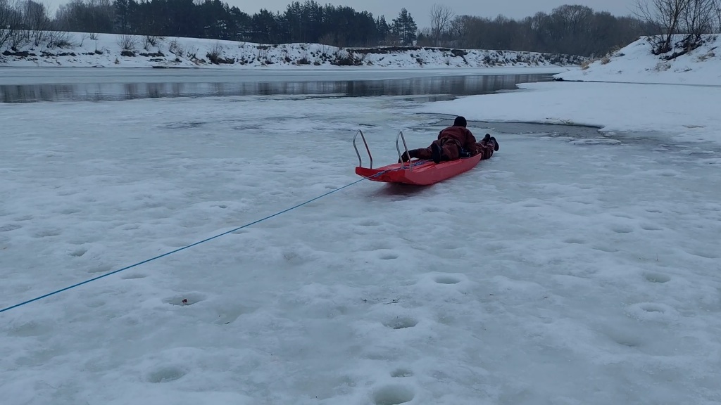 В ходе одного из рейдов провели тренировку с помощью спасательной доски, когда спасатель, лежа на доске, подползает к полынье и помогает рыбаку забраться на нее.
